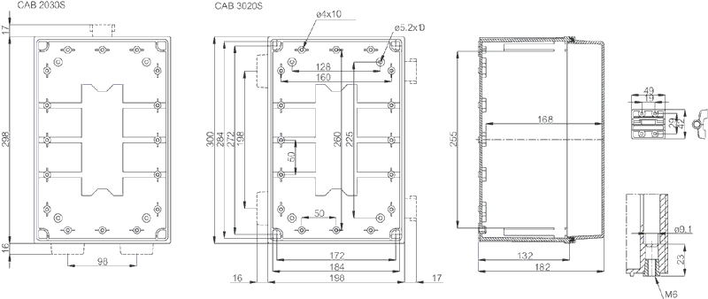 | 300x300x180 | 8113340 | CAB PC 303018 G | 8113342 | CAB PC 303018 G3B | 8113040 | CAB PC 303018 T | 8113042 | CAB PC 303018 T3B | 8183340 | CAB ABS 303018 G | ||
